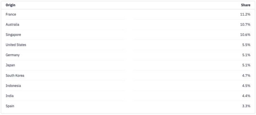 In the past 30 days, the top origin countries for travelers to Bali have shown a varied profile, with Australia, China, and the United States leading the way. These countries represent the most substantial sources of tourists, indicating robust demand from these regions. Investors should consider focusing their marketing and outreach efforts on these countries to enhance tourist inflow.